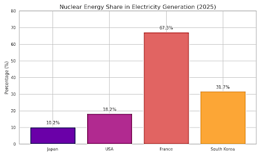 The comparison above highlights Japan’s position within the global nuclear landscape. It is seen that, while its share is lower, its trajectory is upward, driven by climate commitments, energy security concerns, and a strong regulatory framework.