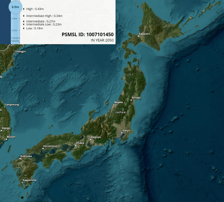 Projections from the IPCC Sixth Assessment Report and the NASA Sea Level Projection Tool suggest that Japan could see a further 15–25 cm of SLR by 2050 under mid-range emissions scenarios, and more than 30 cm if global emissions remain high. By 2100, global mean sea level could rise by 0.44–0.76 m, with Japanese coasts expected to track a similar range.​