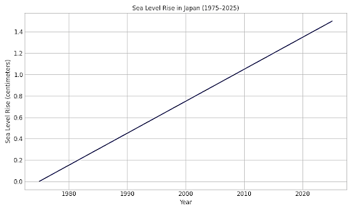 Figure 1 illustrates an idealized reconstruction of this trend, showing a steady rise in average sea level around Japan between 1975 and 2025 (~3–4 mm/year rise based on JMA tide-gauge averages).