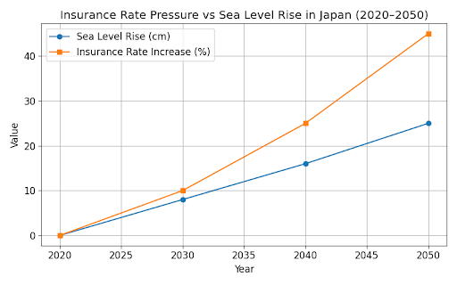 Figure 3. Insurance Rate Pressure vs Sea Level Rise (Japan, 2020–2050)