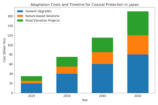 Detailed sectoral studies estimate that upgrading and maintaining coastal structures in some municipalities may cost between ¥5 billion and ¥ 40 billion per community, depending on coastline length, design standards, and local exposure. Nationwide, full implementation of coastal protection and adaptation measures is expected to extend into the 2050s, with regular upgrades as SLR accelerates.