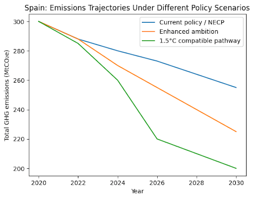 Therefore, Spain is on track to meet the formal EU-aligned 2030 target (32% reduction) but unlikely to exceed it significantly without stronger measures.